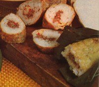 - Take a piece of banana leaf or aluminum foil. Put in 2 tablespoon of the rice, flatten it and put 2 teaspoon of the ground beef mixture on the top. Enclose the filling with another 2 tablespoon of rice. Roll the banana leaf or foil into a roll. Secure the ends tightly.